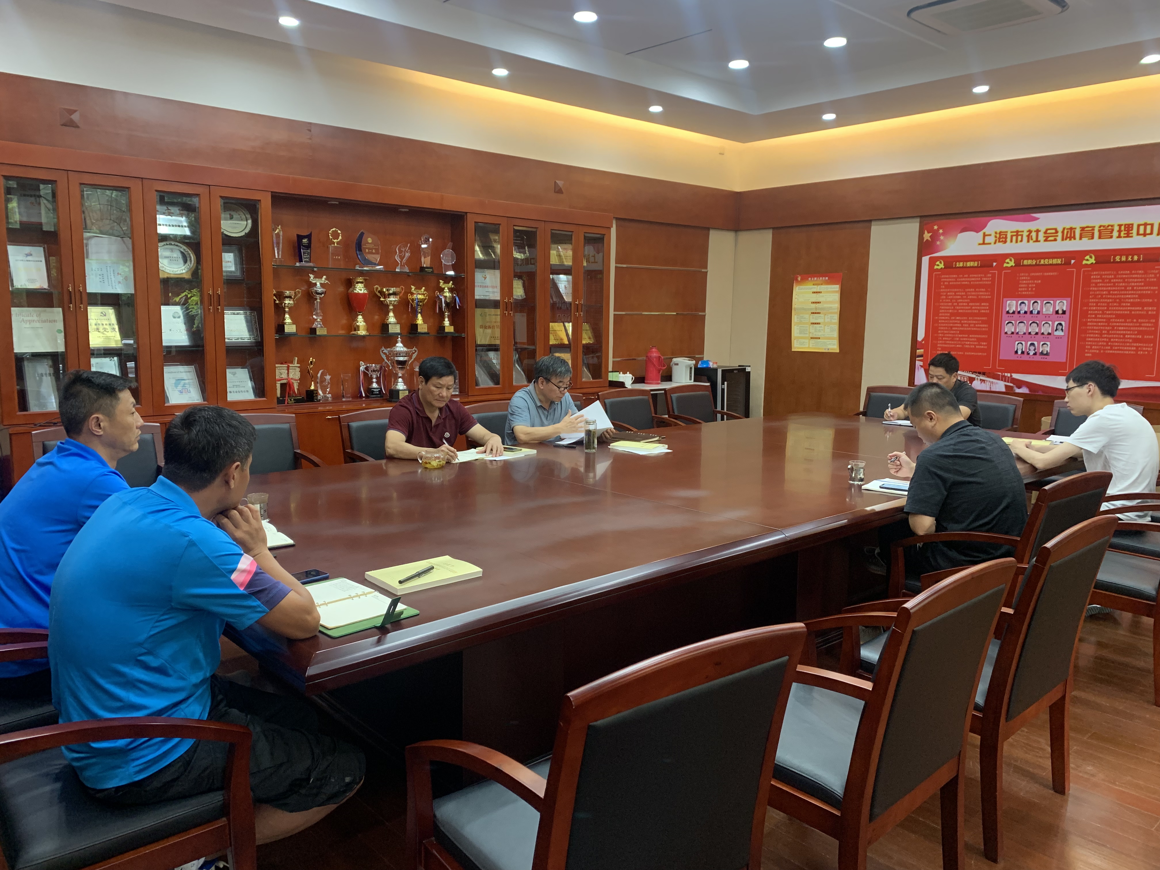 2019年7月24日上午9:30,社体中心全体党员及中层干部在中心会议室开展主题教育专题学习会。会议由中心主任龚以庆同志主持,主要学习了以下三个方面的内容: